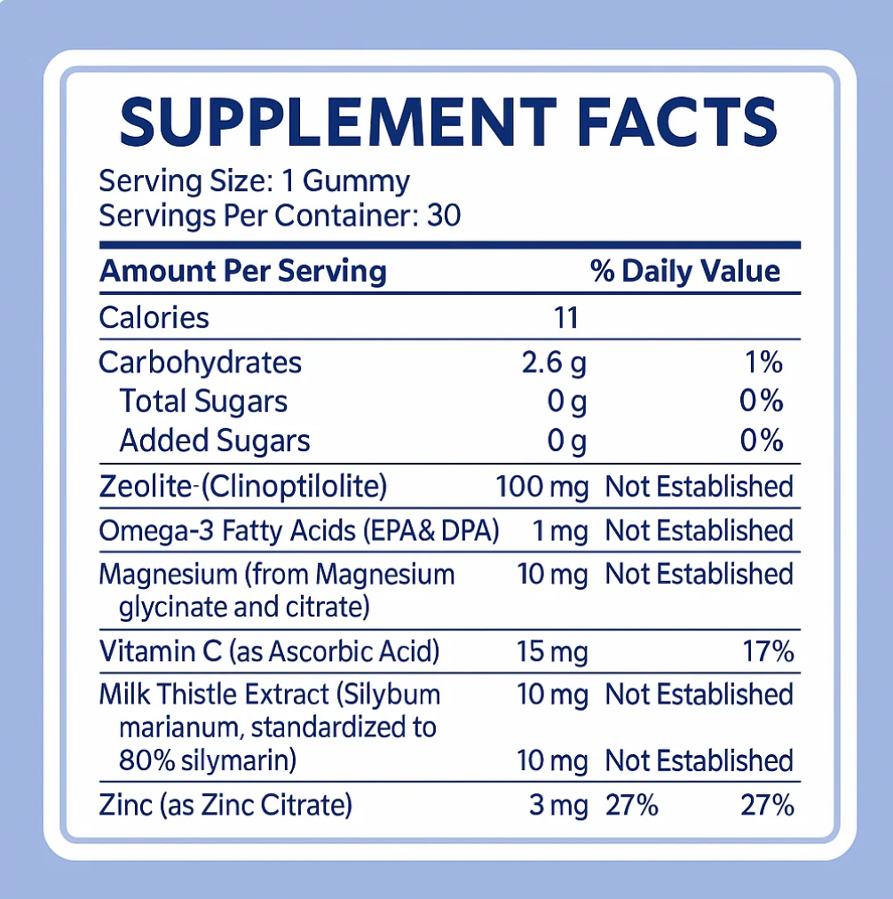 Zeolite helps gently remove these toxins, while added nutrients like Vitamin C, Zinc, Magnesium, Omega-3s, and Milk Thistle support immunity, growth, and overall wellness.